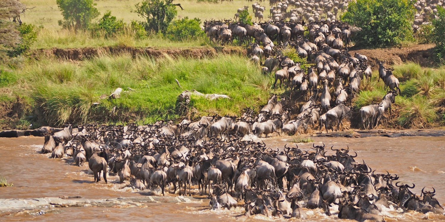 The great migration is an all year event, dictated by the seasons and where the rains are, with Mara River crossing being the climax of the migration period. The Mara River crossing is one of the highlights as the animals try to cross the crocodile infested Mara River, during which many cannot escape the giant nile crocodiles lying in wait for their prey.